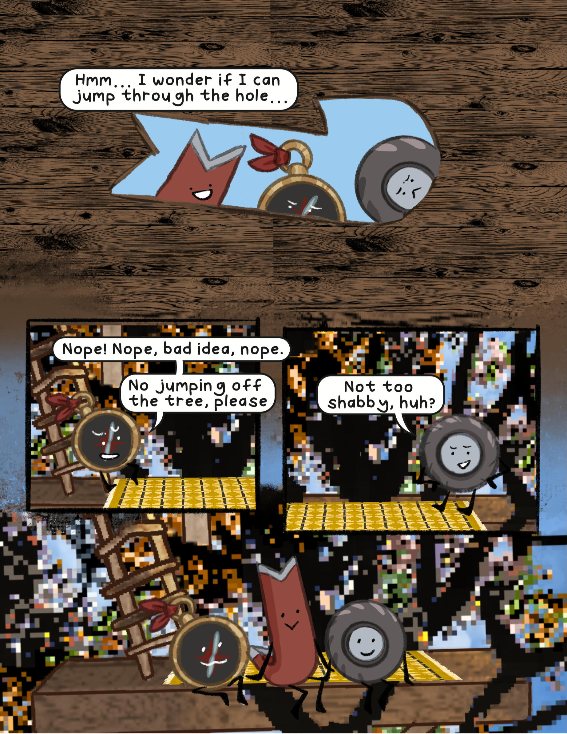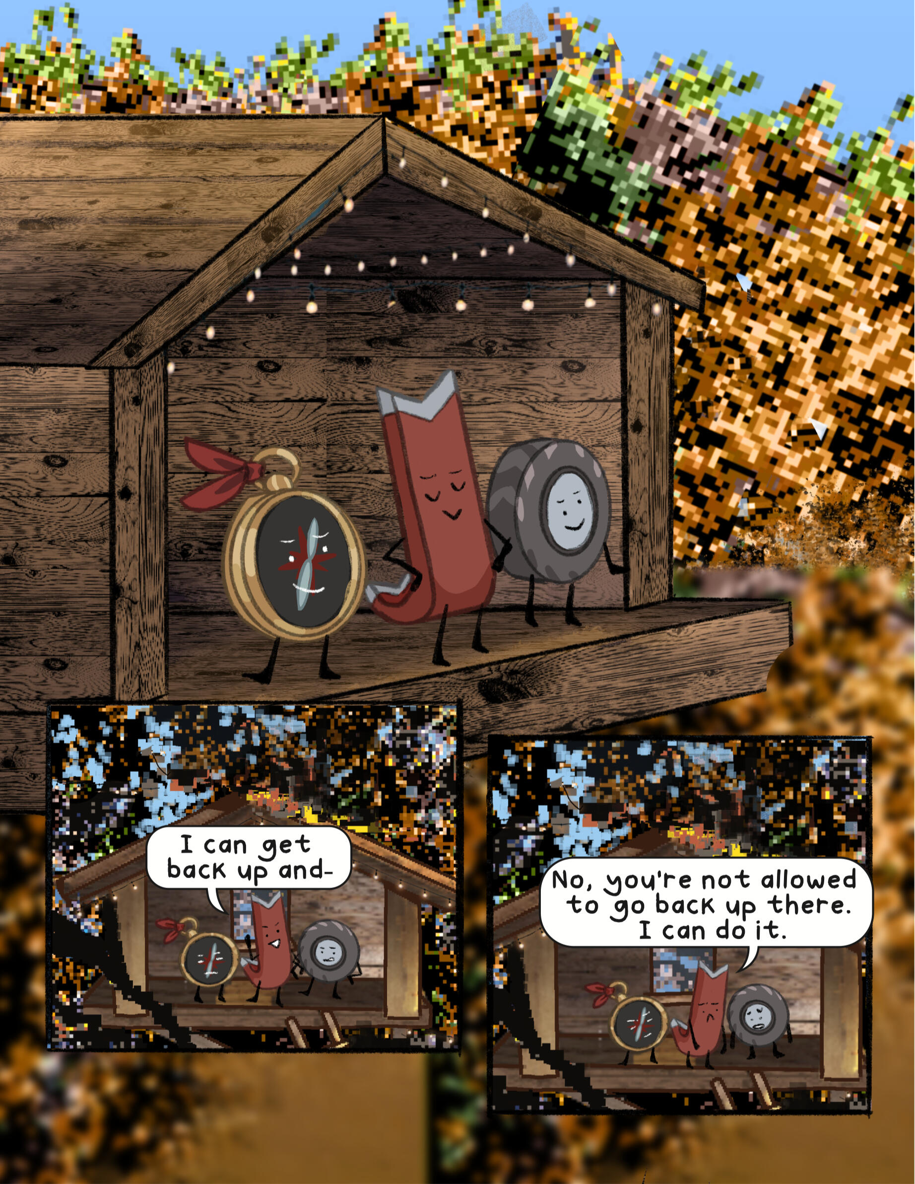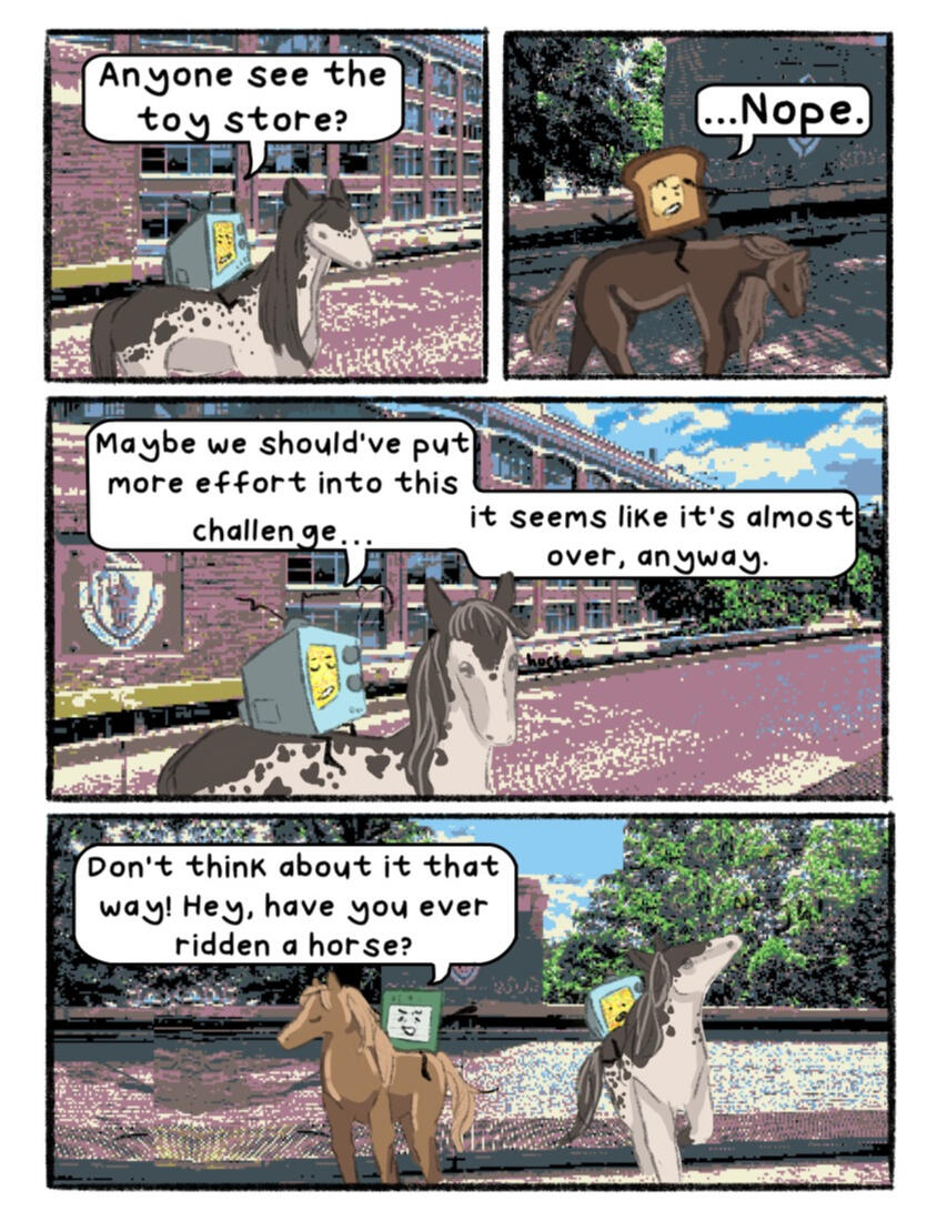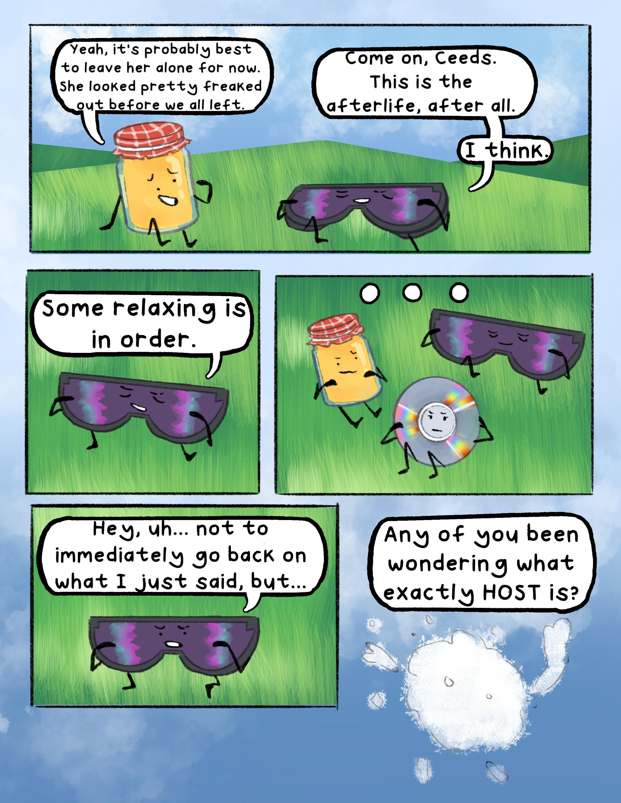 The afterlife was unimpressive, now that Compass had a free moment to really look at it. They weren’t sure what they had expected, really. An endless expanse, a beautiful sky that stretched as far as the eye could see, maybe? Whatever they had expected, it wasn’t… this. They hadn’t expected the brightness of it all, they hadn’t expected a replica of what Safety Goggles claims is a city back on Earth, and they, most of all, hadn’t expected… whatever HOST was. Despite the size of the mainframe, and all of its interesting features, it all felt almost like a computer game that was still in development. There were no trees, and other than the city, no landmarks. Just bright green hills and a body of water that, despite appearing to go on forever, felt small, somehow.The water inside the mainframe’s body of water, which was where they happened to find themself at the current moment, was warm. Not ‘tub’ warm, not the hot water Compass could remember if they thought really hard, but definitely not ocean temperature. It was unnatural, but somewhat welcome. They supposed it made sense, really. Crowbar had dubbed the body of water not an ocean, but the “Big Water”. Not a pond, not an ocean, not really any kind of natural water formation, but, well, water that was big.Nothing in the mainframe was natural, to be fair. If Compass shut their eyes tight and tried to ignore the quiet but shrill ringing that seemed ever present, they could almost pretend. Pretend none of this had ever happened, pretend that they were back wherever they came from, where they had more than two limbs and weren’t dead. Pretend they knew their name, their family, where they came from, even pretend they knew their face. But then, the bright, almost fluorescent light of the mainframe would peek through their eyelids (if they could even call them that, really), and they would remember.Compass was in the middle of a session of this, standing in the water and pretending desperately that they were home, when a stray wave from Tire and Crowbar’s fight knocked them over, sending them face down into the water.“Ope, sorry, C!” Crowbar yelled, his shrill voice cutting through the sound of the splashing water. He seemed desperate to assign nicknames to the whole team (despite the short length of their names already), and ‘C’ was his current attempt. If you asked anyone but him, it wasn’t working out very well. On the other hand, it was entertaining him, so Compass was happy to let it be for now.A louder splash. “Crowbar, you dork, don’t splash Compass!” They opened their eyes to see Crowbar face down in the water, with Tire standing over him and holding his head under the water. “Sorry, um, about that,” Tire said, sheepishly.They sat up in the water, shaking off a few of the droplets on their face. “It’s fine, no harm done. I don’t think you really even can do any harm here. Since we’re, uh… dead, and all.” They said, shrugging as best they could without having shoulders.Tire’s eyes glazed over slightly, and Compass immediately realized their mistake. “Er- um, sorry, didn’t mean to… remind you,” they said sheepishly. She had been slightly out of it ever since the whole memory-regaining thing at the end of the first ‘episode’, as HOST had called it. This whole water splashing fight had been Crowbar’s idea, to help cheer her up and distract her. Compass mentally cursed themself for being the one to disrupt the illusion.Tire shook her head, then moved to adjust her hands on Crowbar, who she was still holding underwater. “No, no, it’s fine, really. I like thinking about my sister, anyway.” Crowbar resurfaced and she jumped to shove him back under, laughing the whole while, but it was clear (to Compass, anyway) that her mind was still elsewhere.Compass hummed. “What… was it like?” As soon as the words left their mouth, they regretted them. Nice going, Compass, remind the cool girl about her sister that might be dead! Furthermore, ask her to talk about said sister! I’m sure that’s totally what she wants right now!Tire furrowed her brow. “What was… what like?”Compass blushed. “Um- having a sibling. I don’t… I mean, maybe there’s no inherent feeling that you had a sibling, but I… don’t feel like I ever had one,” they continued.Tire sighed. “It was… like having a best friend that hated you sometimes, but that you were obligated to still spend time with. Cammie was- no, is, my favorite person, even if she drives me nuts sometimes,” she said, eyes unfocused. “I don’t think that I remember everything from my childhood, but I remember her. Maybe that says something about what having a sibling is, I think? They’re someone that you’ll remember when an evil weird scribble being gives you back a limited number of your memories. Because they were that important to you. I think she’s the reason I’ve been fighting so hard to get home. I need to know she’s okay, y’know?” Tire said.Compass smiled. “She sounds… great,” they said, quietly.“She is. ” Tire frowned. “She helped pick out my name, I just… remembered that. When I first came out, she asked me if I’d thought of a name yet, and when I said I hadn’t, she made a whole whiteboard presentation of names,” she chuckled.Compass tilted their head. “Well… what did you end up picking?”Tire smiled. “Mercedes. My name is Mercedes.”They smiled back. “It’s nice to meet you, Mercedes.”Tire had been distracted for too long, and Crowbar was able to slip out of her grasp. He shot up, grabbing her head and shoving her underwater. “Revenge!” he yelled, as droplets splashed onto Compass from where they sat. The two of them started trying to dunk each other under the water, sending even more droplets splashing onto Compass. They didn’t mind, though. If anything, it was entertaining.‘Mercedes,’ Compass thought. ‘A nice name. It suits her.’ Comp
