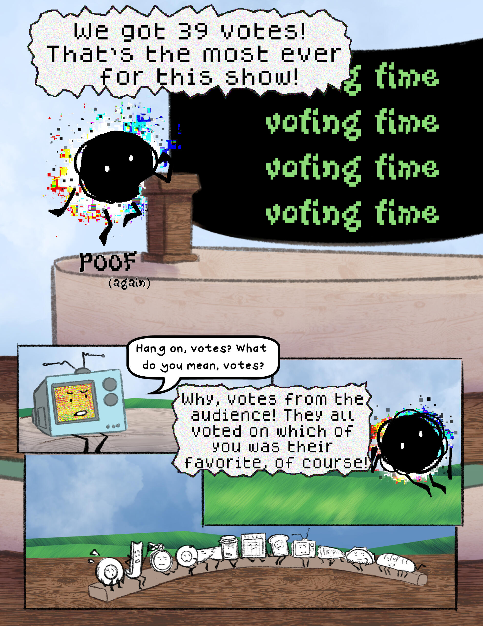 TV (they/them) wishes they had a sharpie to draw on themself with. They are one of the only contestants without arms, which annoys them to no end. TV is very punk, and often suggests dangerous plans that usually work out for TV and their team
