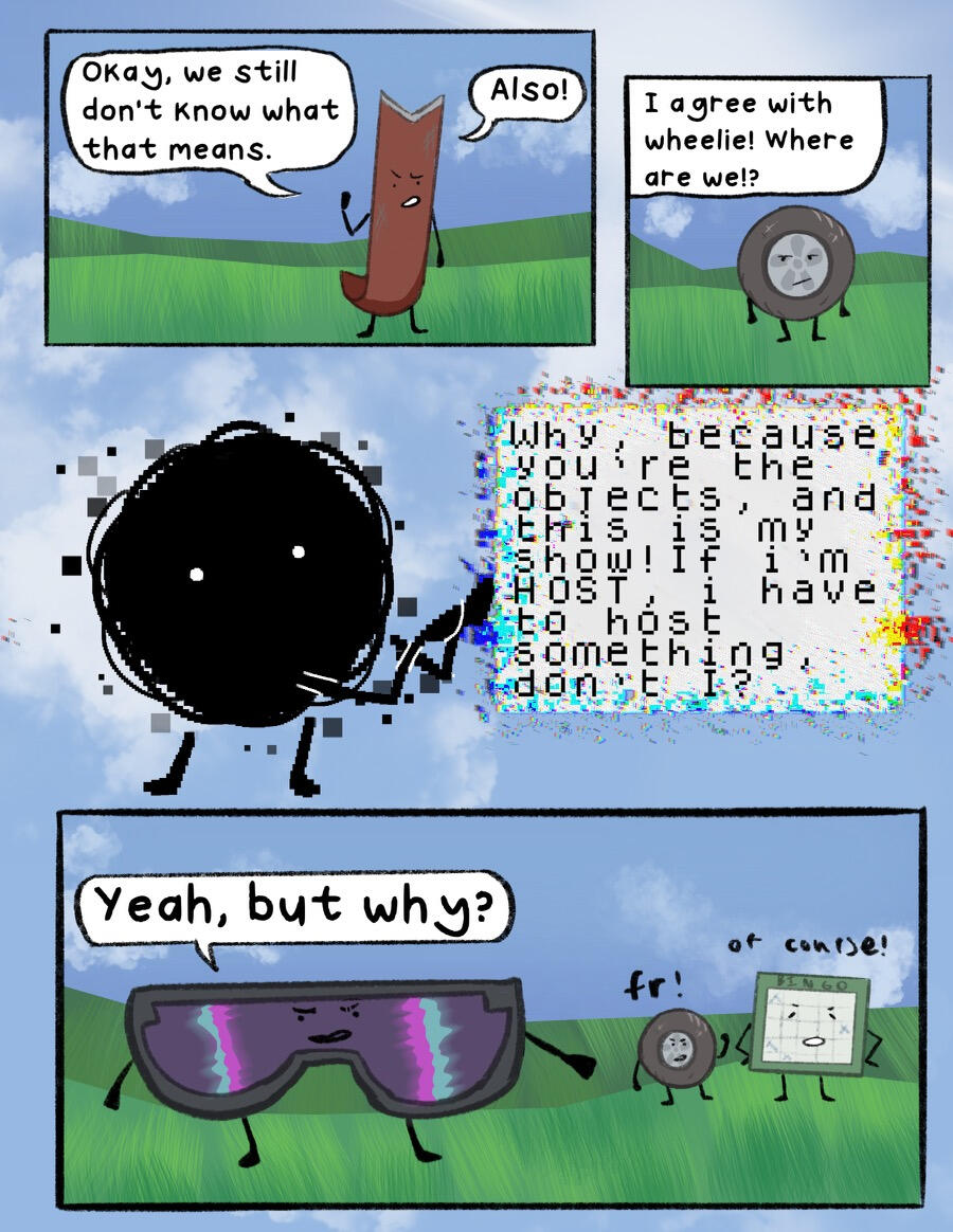 Static had only started to drip from Tire’s eyes when Honey guided CD away. She needs space, she said. This is personal, she wouldn’t want us seeing it, she’d continued. CD had the suspicion that Honey didn’t want her to look, didn’t want her to see. Despite only knowing her for a little while—well, time didn’t actually pass in the mainframe, or it didn’t seem, to at least, so she had no idea how long they’d known each other now—she had already started to think of her as some kind of motherly figure, and she suspected that Honey felt the same. Not that she’d ever admit that, obviously. That’d be showing weakness, and she couldn’t afford to show any of that to her competitors.CD was determined to win, that much was obvious not only to her, but also to everyone she’d interacted with so far. The one question she couldn’t quite answer was… why? Honey and Safety Goggles seemed content to make friends, spend time discussing pointless topics rather than strategies for their team to win. CD, on the other hand, could hardly think of anything other than winning. It was a desperation, an obsession that she couldn’t explain. The reason seemed to be on the tip of her tongue, but melted away when she tried to bring it to mind.Honey’s arm was still on hers, guiding her across one of the hills, away from Tire. She glanced back. The static seemed to be dripping out of her eyes now, tear-like but too thick to be mistaken for it. It fell into puddles on the ground, where it just… sat, not absorbing into the soil.“Hey, woah, y’guys see that?” said Safety Goggles, catching up with the two of them. Her eyes were wide, and she seemed… a little nauseous.Honey sighed. “Yes, and I don’t think we should comment on it. She’s clearly in a vulnerable place right now, we shouldn’t gossip about it,” she said, giving Safety Goggles the Look that CD recognized from all the times it’d been pointed at her.She shrunk a bit, seeming almost ashamed. “Er- um, yeah, my bad,” she said, voice quiet.The three of them stopped walking a while away from Tire and her teammates, where Honey and Safety Goggles struck up a conversation. Just like usual, it was a conversation about nothing in particular. CD absentmindedly, almost cruelly, thought that if a future challenge involved talking as much as possible without actually saying anything of note, their team had it in the bag.They almost had it in the last challenge, anyway. They had been so close to winning, just one object left! And yeah, maybe CD wouldn’t have won the MVP prize, but she’d solved a few riddles! She would have gotten a good number of points! But no, of course, Tire had to steal the spotlight again, just like she had when she first arrived. They’d all arrived at around the same time, but stupid Tire just had to be fashionably late.And, now, Tire got to remember. She got to know her motivation for the game, got to know why she was here. Why she wanted to go back. CD, on the other hand, still couldn’t remember a thing, other than that she had to get back.As they stood in the grass, she heard whispers among the contestants that passed them, contestants who Honey hadn’t dragged out of there the second something scary started happening. She overheard their voices, quiet but sure about what they’d overheard. A sister, a crash. A dead parent. She tried not to listen out of respect (because even if she wasn’t Tire’s biggest fan, she did win the first challenge, which granted her at least a sliver of respect in CD’s book), but it still made her think. Did she have a sibling? Siblings? She felt like she did.“You’re lookin’ awful thoughtful over there,” chuckled Safety Goggles from her side. She thought she heard a mutter of ‘out of character’, but elected to ignore it.She sighed, sitting down in the grass. If she was going to have this conversation, she was at least going to be comfortable while she talked. “Do you guys… ever wonder why you’re here? I mean, like, why you… joined the game in the first place. Why you want to go back,” she said, quietly, unsure of her words even as they came out of her mouth.Honey hummed. “I guess so,” she replied, joining her in the grass. “I don’t think I’ve really thought about that until now.”CD looked at her, surprised. “You- you haven’t thought about it? What about- like, do you not have an inner voice or something screaming at you that you have to get back?” she questioned, confused. It had been almost all she’d been able to think of since she’d opened her eyes, the panicked voice in her head telling her that she had to win, no matter what she had to do, she had to win.Safety Goggles joined the two of them on the grass, eyes slightly concerned. “Uh, yeah, definitely not. Y’good, kid? Has that been happening the whole time?” she said, gently, as if not to scare her off. CD absentmindedly thought that this was the first time she’d ever heard her voice be gentle.She shrugged, trying to think of the best way to phrase it. “I don’t- yeah, maybe?” she groaned, hugging her knees to her chest. “Something in me just feels so… frantic. I don’t really know how to describe it. It’s dumb, just- forget I said anything.”Honey wrapped her arm around her shoulder. “Hey, no, it’s okay! Maybe you just… have more of a reason to get back than the two of us. You do seem younger, so… maybe you’ve got more to live for?” She mumbled. “Sorry, that sounds so morbid!” she laughed.Safety Goggles let out a boisterous laugh. “Oh, what, you saying I don’t have anything to live for? Very nice, Hon,” she chuckled.Honey giggled. “I didn’t mean it like that, you know that!” she said, playfully swatting Safety Goggles on the arm.CD rolled her eyes and started to tune the two of them out, zoning out with Honey’s arm still wrapped comfortably around her shoulder. More to live for… no, that wasn’t quit