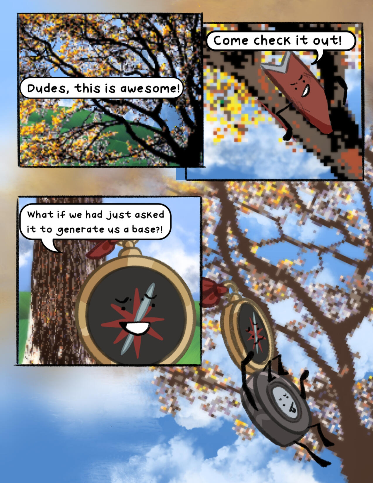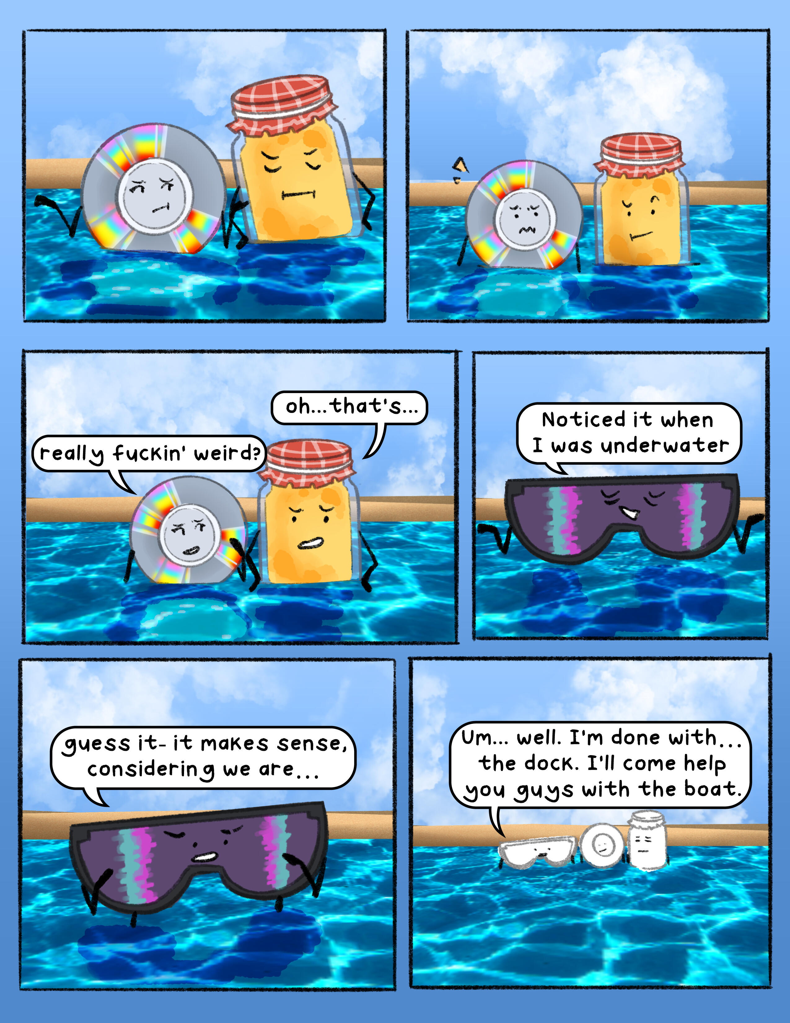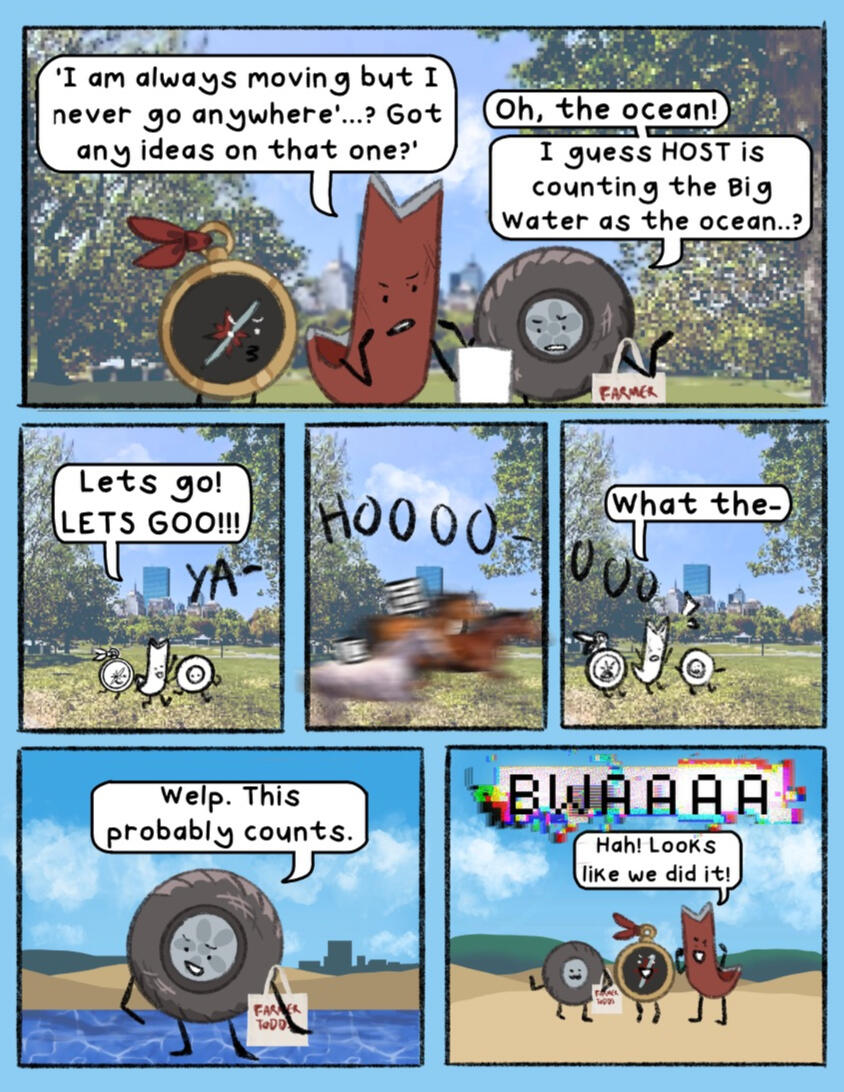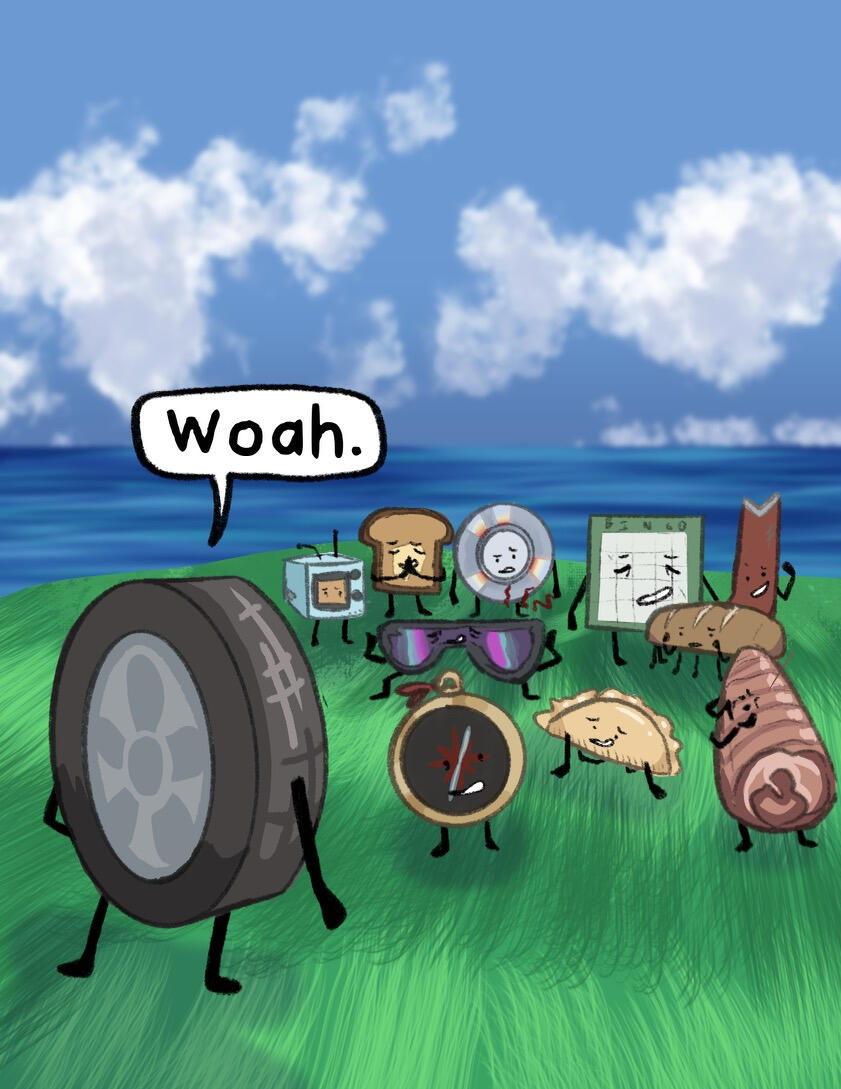 The afterlife was unimpressive, now that Compass had a free moment to really look at it. They weren’t sure what they had expected, really. An endless expanse, a beautiful sky that stretched as far as the eye could see, maybe? Whatever they had expected, it wasn’t… this. They hadn’t expected the brightness of it all, they hadn’t expected a replica of what Safety Goggles claims is a city back on Earth, and they, most of all, hadn’t expected… whatever HOST was. Despite the size of the mainframe, and all of its interesting features, it all felt almost like a computer game that was still in development. There were no trees, and other than the city, no landmarks. Just bright green hills and a body of water that, despite appearing to go on forever, felt small, somehow.The water inside the mainframe’s body of water, which was where they happened to find themself at the current moment, was warm. Not ‘tub’ warm, not the hot water Compass could remember if they thought really hard, but definitely not ocean temperature. It was unnatural, but somewhat welcome. They supposed it made sense, really. Crowbar had dubbed the body of water not an ocean, but the “Big Water”. Not a pond, not an ocean, not really any kind of natural water formation, but, well, water that was big.Nothing in the mainframe was natural, to be fair. If Compass shut their eyes tight and tried to ignore the quiet but shrill ringing that seemed ever present, they could almost pretend. Pretend none of this had ever happened, pretend that they were back wherever they came from, where they had more than two limbs and weren’t dead. Pretend they knew their name, their family, where they came from, even pretend they knew their face. But then, the bright, almost fluorescent light of the mainframe would peek through their eyelids (if they could even call them that, really), and they would remember.Compass was in the middle of a session of this, standing in the water and pretending desperately that they were home, when a stray wave from Tire and Crowbar’s fight knocked them over, sending them face down into the water.“Ope, sorry, C!” Crowbar yelled, his shrill voice cutting through the sound of the splashing water. He seemed desperate to assign nicknames to the whole team (despite the short length of their names already), and ‘C’ was his current attempt. If you asked anyone but him, it wasn’t working out very well. On the other hand, it was entertaining him, so Compass was happy to let it be for now.A louder splash. “Crowbar, you dork, don’t splash Compass!” They opened their eyes to see Crowbar face down in the water, with Tire standing over him and holding his head under the water. “Sorry, um, about that,” Tire said, sheepishly.They sat up in the water, shaking off a few of the droplets on their face. “It’s fine, no harm done. I don’t think you really even can do any harm here. Since we’re, uh… dead, and all.” They said, shrugging as best they could without having shoulders.Tire’s eyes glazed over slightly, and Compass immediately realized their mistake. “Er- um, sorry, didn’t mean to… remind you,” they said sheepishly. She had been slightly out of it ever since the whole memory-regaining thing at the end of the first ‘episode’, as HOST had called it. This whole water splashing fight had been Crowbar’s idea, to help cheer her up and distract her. Compass mentally cursed themself for being the one to disrupt the illusion.Tire shook her head, then moved to adjust her hands on Crowbar, who she was still holding underwater. “No, no, it’s fine, really. I like thinking about my sister, anyway.” Crowbar resurfaced and she jumped to shove him back under, laughing the whole while, but it was clear (to Compass, anyway) that her mind was still elsewhere.Compass hummed. “What… was it like?” As soon as the words left their mouth, they regretted them. Nice going, Compass, remind the cool girl about her sister that might be dead! Furthermore, ask her to talk about said sister! I’m sure that’s totally what she wants right now!Tire furrowed her brow. “What was… what like?”Compass blushed. “Um- having a sibling. I don’t… I mean, maybe there’s no inherent feeling that you had a sibling, but I… don’t feel like I ever had one,” they continued.Tire sighed. “It was… like having a best friend that hated you sometimes, but that you were obligated to still spend time with. Cammie was- no, is, my favorite person, even if she drives me nuts sometimes,” she said, eyes unfocused. “I don’t think that I remember everything from my childhood, but I remember her. Maybe that says something about what having a sibling is, I think? They’re someone that you’ll remember when an evil weird scribble being gives you back a limited number of your memories. Because they were that important to you. I think she’s the reason I’ve been fighting so hard to get home. I need to know she’s okay, y’know?” Tire said.Compass smiled. “She sounds… great,” they said, quietly.“She is. ” Tire frowned. “She helped pick out my name, I just… remembered that. When I first came out, she asked me if I’d thought of a name yet, and when I said I hadn’t, she made a whole whiteboard presentation of names,” she chuckled.Compass tilted their head. “Well… what did you end up picking?”Tire smiled. “Mercedes. My name is Mercedes.”They smiled back. “It’s nice to meet you, Mercedes.”Tire had been distracted for too long, and Crowbar was able to slip out of her grasp. He shot up, grabbing her head and shoving her underwater. “Revenge!” he yelled, as droplets splashed onto Compass from where they sat. The two of them started trying to dunk each other under the water, sending even more droplets splashing onto Compass. They didn’t mind, though. If anything, it was entertaining.‘Mercedes,’ Compass thought. ‘A nice name. It suits her.’ Comp
