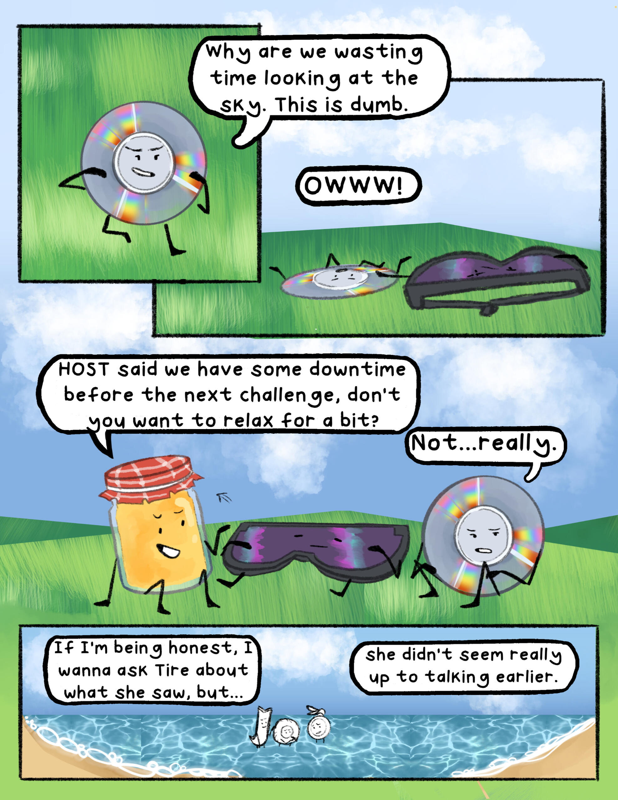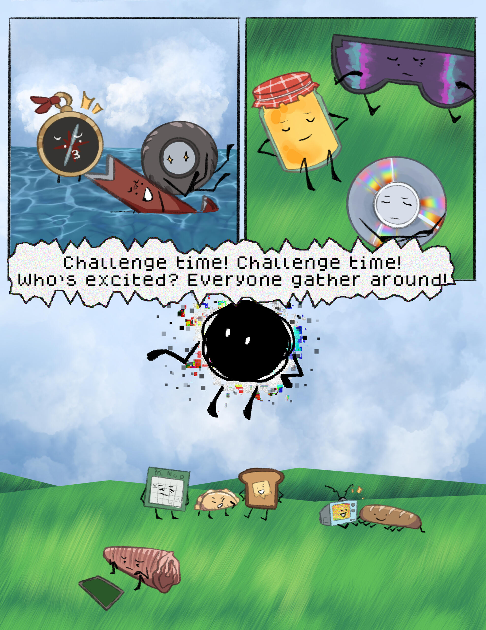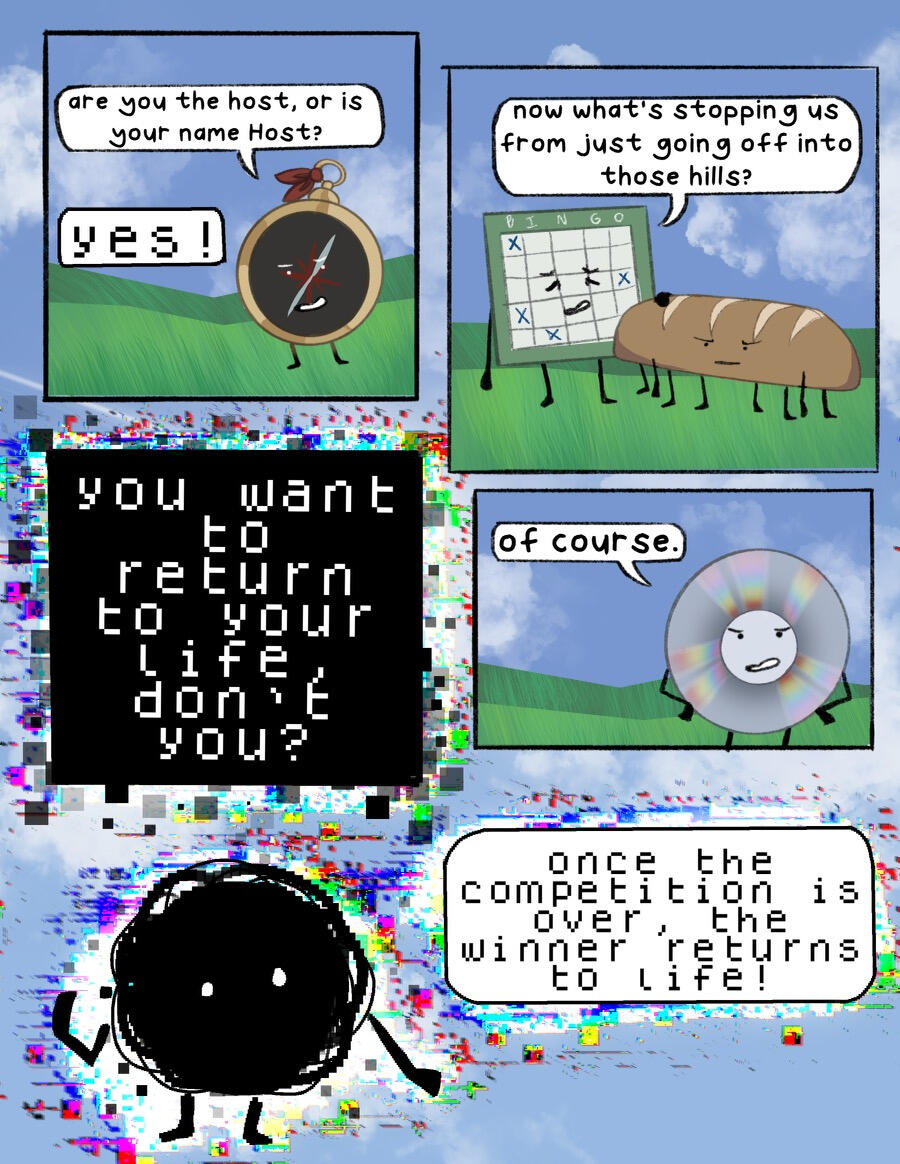 Static had only started to drip from Tire’s eyes when Honey guided CD away. She needs space, she said. This is personal, she wouldn’t want us seeing it, she’d continued. CD had the suspicion that Honey didn’t want her to look, didn’t want her to see. Despite only knowing her for a little while—well, time didn’t actually pass in the mainframe, or it didn’t seem, to at least, so she had no idea how long they’d known each other now—she had already started to think of her as some kind of motherly figure, and she suspected that Honey felt the same. Not that she’d ever admit that, obviously. That’d be showing weakness, and she couldn’t afford to show any of that to her competitors.CD was determined to win, that much was obvious not only to her, but also to everyone she’d interacted with so far. The one question she couldn’t quite answer was… why? Honey and Safety Goggles seemed content to make friends, spend time discussing pointless topics rather than strategies for their team to win. CD, on the other hand, could hardly think of anything other than winning. It was a desperation, an obsession that she couldn’t explain. The reason seemed to be on the tip of her tongue, but melted away when she tried to bring it to mind.Honey’s arm was still on hers, guiding her across one of the hills, away from Tire. She glanced back. The static seemed to be dripping out of her eyes now, tear-like but too thick to be mistaken for it. It fell into puddles on the ground, where it just… sat, not absorbing into the soil.“Hey, woah, y’guys see that?” said Safety Goggles, catching up with the two of them. Her eyes were wide, and she seemed… a little nauseous.Honey sighed. “Yes, and I don’t think we should comment on it. She’s clearly in a vulnerable place right now, we shouldn’t gossip about it,” she said, giving Safety Goggles the Look that CD recognized from all the times it’d been pointed at her.She shrunk a bit, seeming almost ashamed. “Er- um, yeah, my bad,” she said, voice quiet.The three of them stopped walking a while away from Tire and her teammates, where Honey and Safety Goggles struck up a conversation. Just like usual, it was a conversation about nothing in particular. CD absentmindedly, almost cruelly, thought that if a future challenge involved talking as much as possible without actually saying anything of note, their team had it in the bag.They almost had it in the last challenge, anyway. They had been so close to winning, just one object left! And yeah, maybe CD wouldn’t have won the MVP prize, but she’d solved a few riddles! She would have gotten a good number of points! But no, of course, Tire had to steal the spotlight again, just like she had when she first arrived. They’d all arrived at around the same time, but stupid Tire just had to be fashionably late.And, now, Tire got to remember. She got to know her motivation for the game, got to know why she was here. Why she wanted to go back. CD, on the other hand, still couldn’t remember a thing, other than that she had to get back.As they stood in the grass, she heard whispers among the contestants that passed them, contestants who Honey hadn’t dragged out of there the second something scary started happening. She overheard their voices, quiet but sure about what they’d overheard. A sister, a crash. A dead parent. She tried not to listen out of respect (because even if she wasn’t Tire’s biggest fan, she did win the first challenge, which granted her at least a sliver of respect in CD’s book), but it still made her think. Did she have a sibling? Siblings? She felt like she did.“You’re lookin’ awful thoughtful over there,” chuckled Safety Goggles from her side. She thought she heard a mutter of ‘out of character’, but elected to ignore it.She sighed, sitting down in the grass. If she was going to have this conversation, she was at least going to be comfortable while she talked. “Do you guys… ever wonder why you’re here? I mean, like, why you… joined the game in the first place. Why you want to go back,” she said, quietly, unsure of her words even as they came out of her mouth.Honey hummed. “I guess so,” she replied, joining her in the grass. “I don’t think I’ve really thought about that until now.”CD looked at her, surprised. “You- you haven’t thought about it? What about- like, do you not have an inner voice or something screaming at you that you have to get back?” she questioned, confused. It had been almost all she’d been able to think of since she’d opened her eyes, the panicked voice in her head telling her that she had to win, no matter what she had to do, she had to win.Safety Goggles joined the two of them on the grass, eyes slightly concerned. “Uh, yeah, definitely not. Y’good, kid? Has that been happening the whole time?” she said, gently, as if not to scare her off. CD absentmindedly thought that this was the first time she’d ever heard her voice be gentle.She shrugged, trying to think of the best way to phrase it. “I don’t- yeah, maybe?” she groaned, hugging her knees to her chest. “Something in me just feels so… frantic. I don’t really know how to describe it. It’s dumb, just- forget I said anything.”Honey wrapped her arm around her shoulder. “Hey, no, it’s okay! Maybe you just… have more of a reason to get back than the two of us. You do seem younger, so… maybe you’ve got more to live for?” She mumbled. “Sorry, that sounds so morbid!” she laughed.Safety Goggles let out a boisterous laugh. “Oh, what, you saying I don’t have anything to live for? Very nice, Hon,” she chuckled.Honey giggled. “I didn’t mean it like that, you know that!” she said, playfully swatting Safety Goggles on the arm.CD rolled her eyes and started to tune the two of them out, zoning out with Honey’s arm still wrapped comfortably around her shoulder. More to live for… no, that wasn’t quit