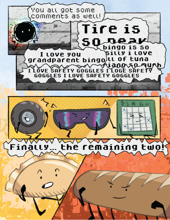 Butter Toast (he/him) has the suspicion that he was boring back when he was alive. He likes taking risks and is one of the most thrill-seeking contestants. His true passion, however, is telling dad jokes (to the annoyance of the rest of the contestants).
