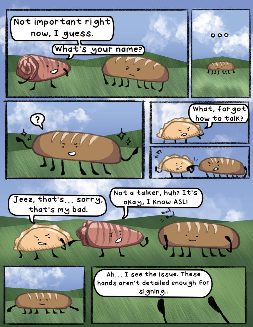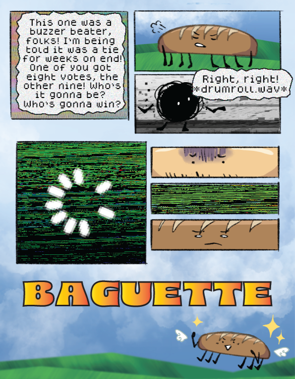 Baguette (she/they) is tired of everyone already. She doesn't talk, yet usually manages to communicate with their team nonetheless. Don't underestimate them, though! Baguette is one of the sneakiest contestants, often coming up with clever plans.